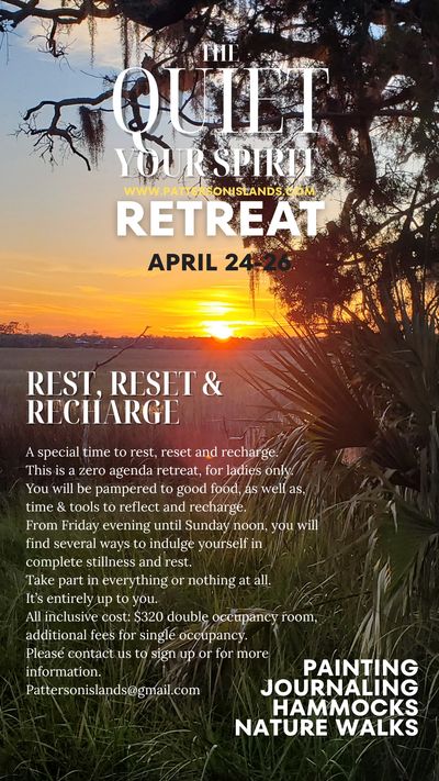 Our Quiet Your Spirit retreat is happening on April 24-26. Details are below. Contact us for more information at Pattersonislands@ gmail.com
